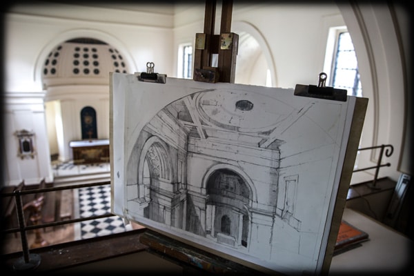 Like London, Hertfordshire is full of hidden magic, you need to tune into it and it reveals itself. The Church of Ayot St Lawrence is such, built on a dark past and stands watching like a sentinel the landscape and world change round it. The sense of an unbroken chain of 243 years of rituals and patterns of the Church has connections with the artist, looking, seeing, making and having a deep understanding of what they are experiencing. Living in a photographic world and instant reactions; drawing and painting from what we see and perceive, becomes more important. We need contemplation and a considered distilled opinion about what we are seeing, experiencing and perceiving. We live in a wonderful world that is deeply traumatised, perhaps by the fact we can access everything at once. Like Pandora’s box the last thing to come of it is Hope.